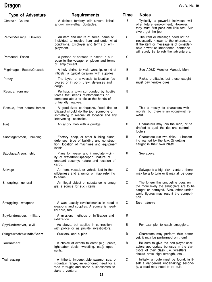 The premise of the article was to provide a handy list of adventure ideas, described only in the broadest terms, along with a classification system for how long it takes to prepare that type of adventure. Class-A adventures took more than two hours to prep. Class-B adventures took under two hours to prep. Class-C adventures took under 20 minutes to prep.